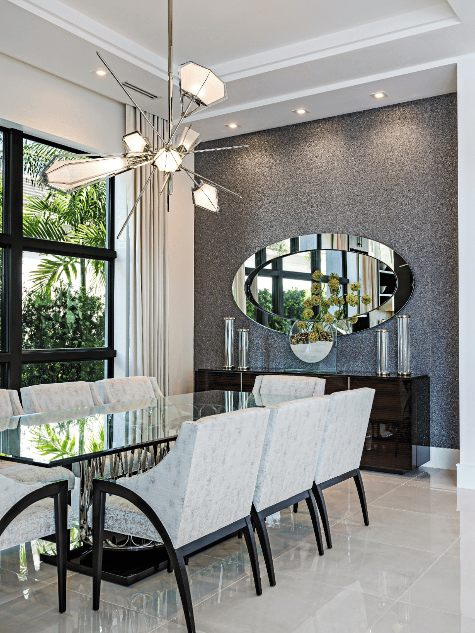 The kitchen features a custom design with sleek cabinetry, a mirrored hood, and book-matched stone counters. A sculpted ceiling with integrated lighting adds depth and highlights the island as the centerpiece. Every detail, from millwork to finishes, was tailored for the client, creating a space that is both modern and highly functional.